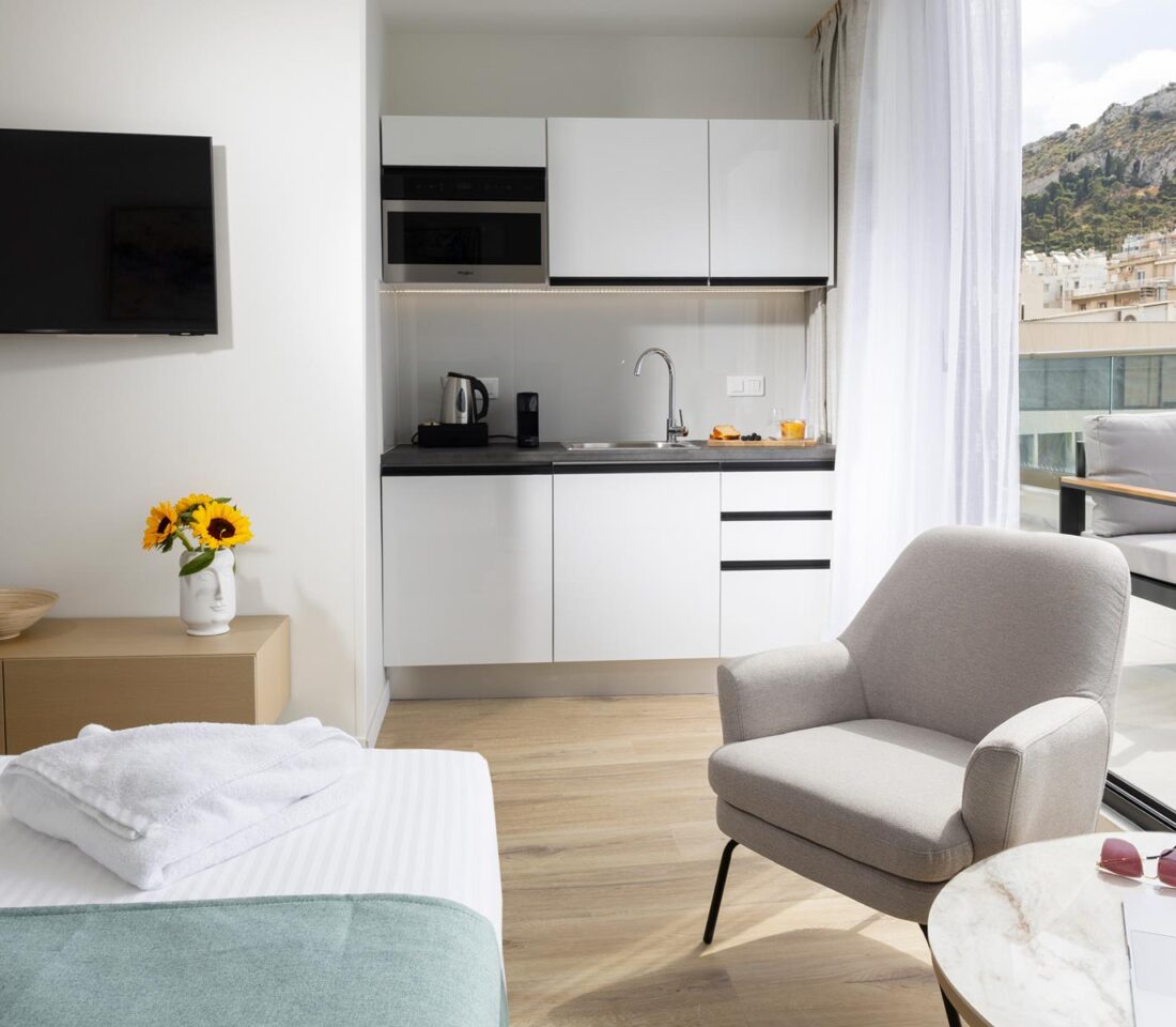 One bedroom - one bathroom, basic kitchenette with dishwasher/ microwave / Nespresso machine, and bathroom with shower. Spacious balcony with outdoor seating and breathtaking views of Lycabettus Hill & Acropolis. Access to the laundry room at the rooftop of the building with common washing machines/dryers for clothes. Amazing view of the Athenian Cultural Centre, the Acropolis & of the Lycabettus Hill from the rooftop, accessible to all residents 24/7!